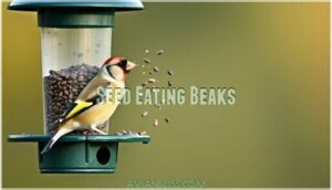 You’ll notice finches and grosbeaks possess cone-shaped beaks that generate impressive seed cracking force. Their conical morphology allows them to tackle different seed sizes efficiently.