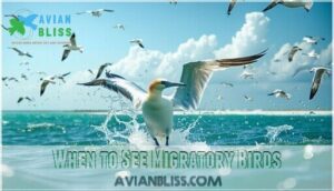 Peak migration occurs during spring (mid-March through late April) and fall (August through October), when diving birds like Northern Gannets and various terns flood coastal waters.