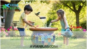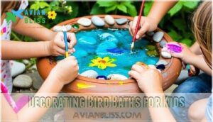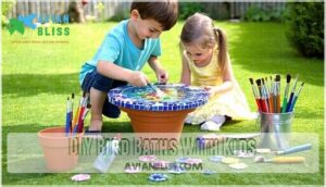 Once dry, don’t forget sealing techniques to protect their masterpiece from weather. It’s a diy bird bath they’ll proudly show off, a true kid-friendly project!