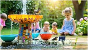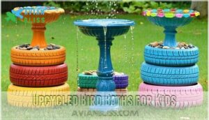 Kids can personalize their diy bird bath by painting cages with non-toxic colors. To prevent algae growth, consider adding a solar fountain pump. It’s a recycled bird bath that doubles as a fun kids garden project everyone will chirp about!