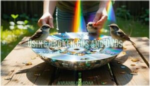 Break CDs into pieces and arrange them in cool patterns on a shallow dish. The reflective surfaces catch sunlight and create mini rainbows that attract curious feathered friends.