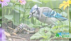 Their diverse Jay Habitat preferences mean they’ll visit various garden areas, ensuring thorough slug management while birds eat garden pests naturally.