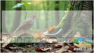 These speckled birds eat slugs by smashing them against rocks, making consumption easier. You’ll spot thrushes systematically hunting through leaf litter and moist soil where slugs hide.