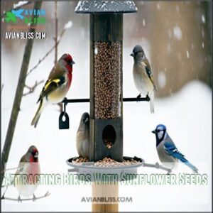 You’ll find that sunflower seeds attract a diverse range of birds including cardinals, finches, chickadees, and woodpeckers to your yard.