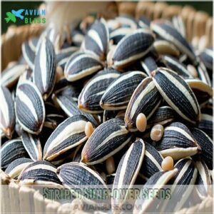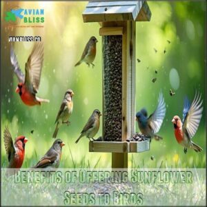 - You’ll support avian health by offering sunflower seeds as they’re packed with protein, healthy fats, and essential minerals—just be sure to keep feeders clean and provide multiple feeding options to encourage diversity.