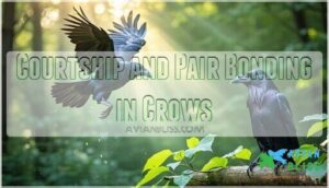 You’ll discover that crow mating behavior involves elaborate courtship rituals where males perform aerial acrobatics, offer gifts, and use soft cooing sounds to attract their chosen partners.