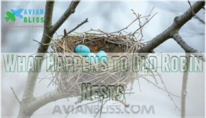Instead of recycling old structures, robins leverage material availability to build new, safe havens, which is an example of nature’s elegant solution to survival—out with the old, in with the new, ensuring their offspring have the best possible start, showcasing the importance of fresh nests and environmental factors.