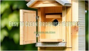 Features like removable side panels and hinged cleanout doors make birdhouse cleaning quick and hassle-free. These designs guarantee you can easily access the interior for thorough maintenance.