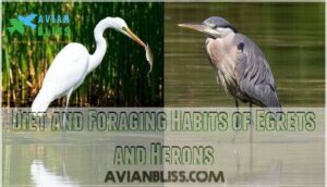 You’ll find that both herons and egrets are true carnivores—fish dominate the menu, making up roughly 73-75% of their diet and hunting behavior. Yet their Prey Composition reveals flexibility: amphibians, crustaceans like crayfish, insects, and even small mammals round out their Feeding Habits.