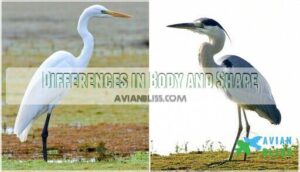Beyond feather displays lies another revealing truth: bill and leg morphology expose stark differences in body and shape. Great Blue Heron bills stretch 12–15 cm—thicker, heavier tools for piercing larger prey—while Great Egret bills measure 9–12 cm, slender and dagger-shaped for quick strikes. You’ll notice herons’ legs reach 20–24 inches, enabling deeper wading abilities, whereas egrets’ 17–21 inch black legs suit shallower foraging strategies. Snowy Egrets flaunt bright yellow feet against black legs—a visual trick for flushing prey.