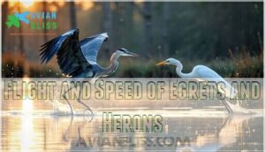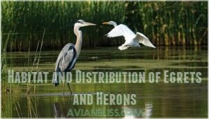 You’ll find over 90% of herons and egrets anchored to shallow aquatic systems—marshes, estuaries, and riverbanks where wetland ecology dictates survival. Their aquatic dependence runs deep: gray herons nest within half a kilometer of water, while great egrets achieve 78% of foraging success in tidal flats.