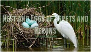 Eggshell patterns reveal striking differences: Great Blue Heron eggs display pale blue hues measuring 6.1–7.6 cm, while Great Egret eggs are smaller (5.5–6 cm) with smooth greenish-blue surfaces.