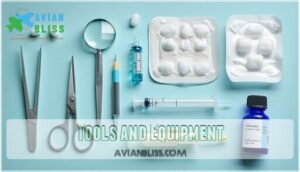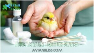 Start with gentle wound cleaning using saline solution—it’s like giving your bird a mini spa treatment. Apply aloe vera sparingly for natural healing benefits.