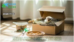 - Maintain warmth and hydration – Keep your injured bird at 80-85°F using heating pads or towels, offer small sips of water to alert birds only, and never give fluids to unconscious birds.