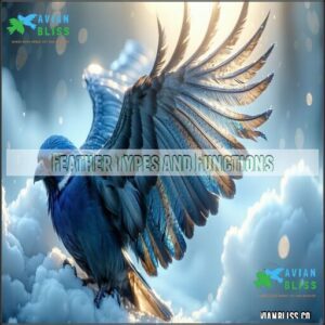 You’ll find that a bird’s wing contains various feather types, each engineered for specific aerodynamic functions from the thrust-generating primaries at the wingtip to the stabilizing coverts near the body.
