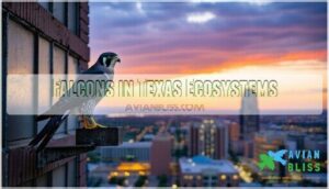 You’ll find falcons playing vital roles as apex predators across Texas’s diverse ecosystems, from coastal marshes to desert highlands.