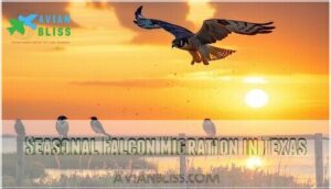 - You’ll encounter ten distinct falcon species in Texas, ranging from the tiny 9-inch American Kestrel to the powerful 25-inch Crested Caracara, with some living year-round while others migrate through seasonally.