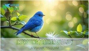 You can restore your bird’s feather quality through targeted nutrition, stress reduction, and proper environmental care that addresses the root causes of discoloration.