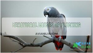 feather plucking causes african greyFeather plucking in African greys often happens due to stress, illness, or environmental factors, and it’s their way of showing something’s wrong.
