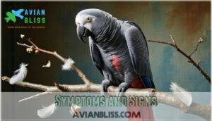 When parrot feather loss occurs, you’ll notice signs like missing patches or broken feathers in common plucking locations, such as the chest or wings.
