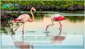 - You’ll find fifteen different species of long-legged wading birds throughout Florida’s wetlands, including Great Blue Herons, Snowy Egrets, Roseate Spoonbills, and even American Flamingos, each perfectly adapted for hunting in shallow waters.