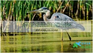 - You can identify these birds by their distinctive leg colors and patterns – Great Blue Herons have yellow-green legs, while their extended limbs allow them to wade deeper than shorter-legged birds without soaking their feathers.