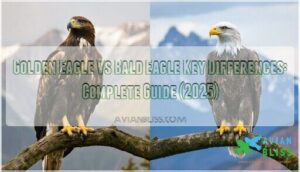 - You’ll identify adult bald eagles by their distinctive white heads and tails paired with bright yellow beaks, while golden eagles maintain consistent dark brown plumage with golden neck patches and smaller black beaks.