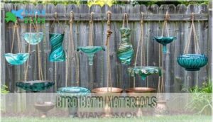 You’ll find hanging bird baths in various materials including glass, ceramic, metal, and polyresin that each offer unique benefits for your feathered visitors.