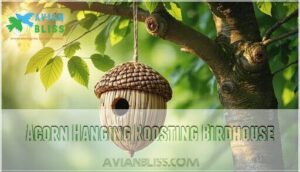 The Acorn Hanging Roosting Birdhouse combines charming acorn design with durable reed grass material, offering excellent roosting benefits for small bird species like wrens and chickadees.