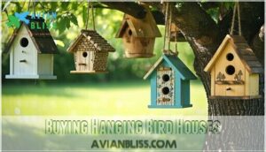 You’ll find hanging birdhouses made from wood, ceramic, resin, and metal materials, each offering different benefits for your backyard birds.