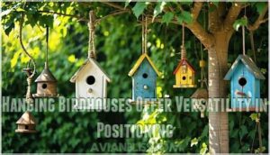 You’ll discover hanging birdhouses crafted from diverse materials, each offering unique benefits.