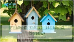 These coating options and climate impact considerations guarantee your birdhouse weatherresistance protects feathered friends through every season while maintaining longevity factors.
