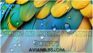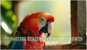 You’ll boost your bird’s feather health through balanced nutrition with protein-rich pellets, fresh vegetables, and clean water.