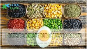 Lean meats, egg benefits, and legume proteins provide essential amino acids for healthy feather growth.