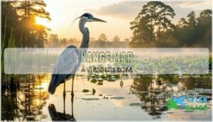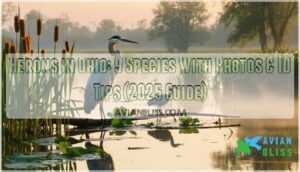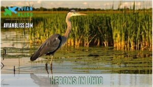 - You’ll find nine distinct heron species throughout Ohio’s wetlands, from the towering 4-foot Great Blue Heron to the tiny 11-inch Least Bittern, each with unique hunting strategies and habitat preferences.