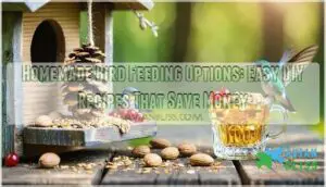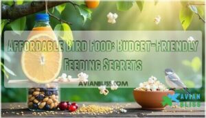 You’ll slash bird food costs by making homemade mixes using kitchen staples like peanut butter, oats, and sunflower seeds instead of buying expensive commercial blends.