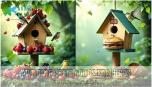 Safe bird food alternatives include black oil sunflower seeds, unsalted nuts, and fresh fruits without pits. A balanced diet requires essential vitamins and minerals for ideal health. Always choose birdsafe ingredients over kitchen scraps.
