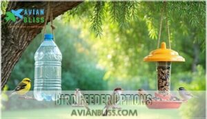 Now that you’ve established a solid winter feeding routine, selecting the right bird feeder types becomes your next important step. Your feeder material choice directly impacts how well it serves your backyard visitors through harsh weather conditions.