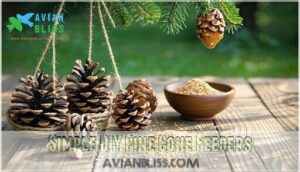 Pine cone feeders offer a perfect starting point for backyard bird enthusiasts. Pinecone Selection matters—choose large, fully opened cones like Ponderosa varieties for maximum surface area. Peanut Butter serves as your adhesive base, so spread it generously into every groove and crevice.