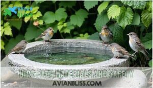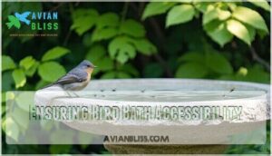 Consider slip-resistant surfaces to make certain birds can safely use the bath. Water replacement becomes easier when you understand proper bird bath depth guide principles. Remember, bathing frequency increases when birds feel secure about water levels, making bird bath depth for safety your top priority when establishing bird bath depth importance.