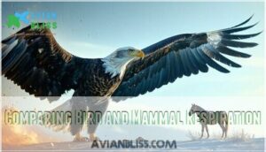 - You’re witnessing nature’s most advanced oxygen delivery system when you watch birds fly at high altitudes – their unidirectional airflow through tiny air capillaries called parabronchi allows them to extract maximum oxygen even where you’d struggle to breathe.