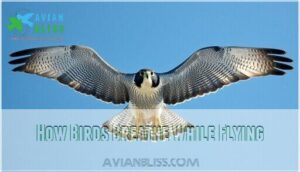 - You’ll discover that birds don’t have a diaphragm like you do – instead, their interconnected air sacs create continuous airflow that never stops, ensuring fresh oxygen reaches their muscles during demanding flight maneuvers.