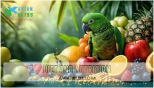 Quality parrot nutrition means fresh fruits, vegetables, and high-grade pellets while avoiding toxic foods like chocolate and avocado.