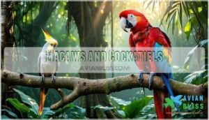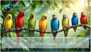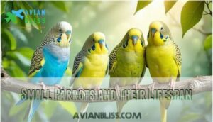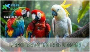 - You’ll find parrot lifespans vary dramatically by size—small budgies live 5-15 years while large macaws can reach 100 years, making them potentially lifetime companions that could outlast you.