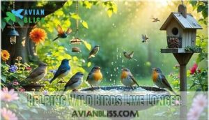 After you’ve created inviting habitats, your next move is minimizing human interference—a subtle yet powerful way to help birds live longer. Limit noise and outdoor lighting, especially during migration, to reduce confusion and collisions. Keep cats indoors and skip pesticides to lessen environmental threats and pollution.