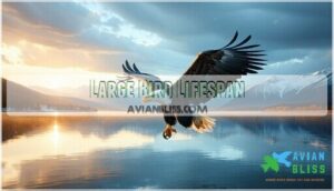 Few animals rival large wild birds when it comes to longevity. With Eagle Lifespans nearing 30 years, and Condor Longevity stretching well past 50, these species show how slower metabolisms and sturdy bodies prolong life. Albatross Survival is legendary—one Laysan albatross has passed age 74. Even Frigatebird Aging impresses, with banded birds exceeding 40 years. Though environmental Factors affecting bird lifespan—like Vulture Threats—remain constant, their avian longevity stands as a symbol of resilience.
