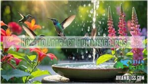 how to attract hummingbirds naturallyYou’ll attract hummingbirds naturally by planting red, tubular flowers like bee balm and cardinal flower. These tiny acrobats can’t resist bright blooms that match their feeding style.