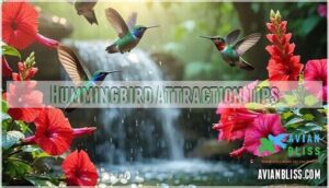 You’ll discover that attracting hummingbirds requires more than just hanging a feeder, since these tiny acrobats have specific preferences for colors, water sources, and safe spaces.
