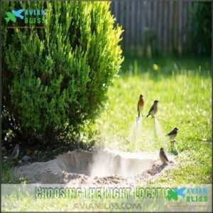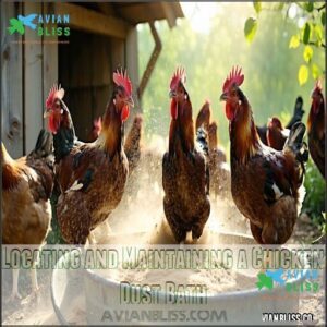 A sunny, dry area near the coop is ideal, offering warmth and pest control benefits from sunlight exposure. Guarantee good drainage solutions to prevent muddy messes, and place the bath in a spot with some shade for hot days.