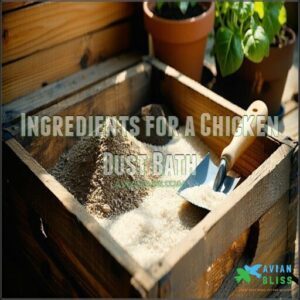 Choose a container—galvanized tubs, shallow bins, or an elevated bath work well. Mix key dust bath materials like builder’s sand, untreated soil, and wood ash, adjusting ingredient ratios seasonally.